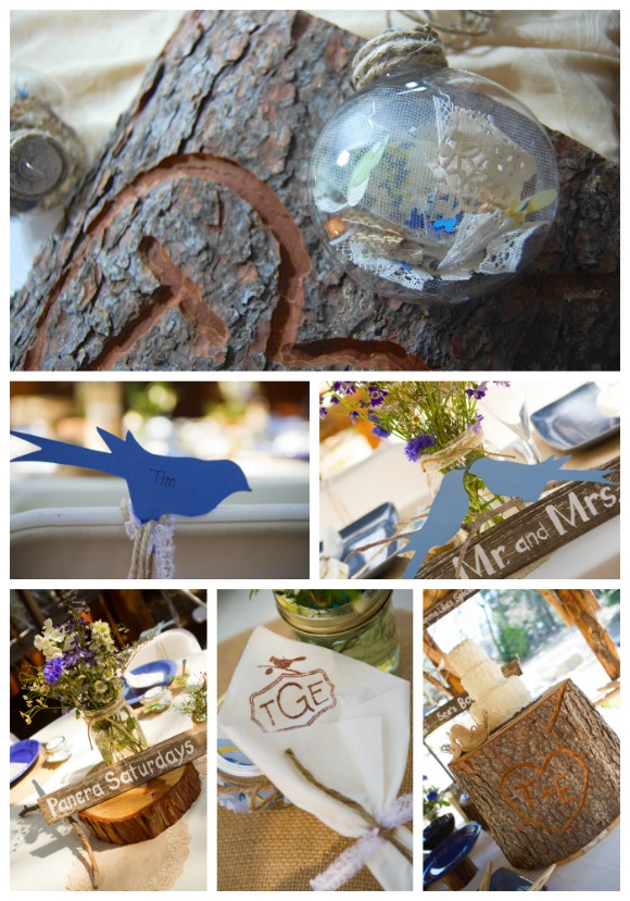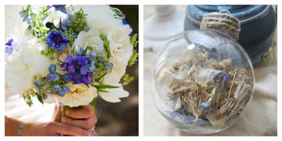 One ornament is filled with dried flowers from my bouquet, the other is filled with miscellaneous wedding ephemera (I love that word…). She used clear, plastic ornaments from Michaels, which come in multiple shapes and sizes.